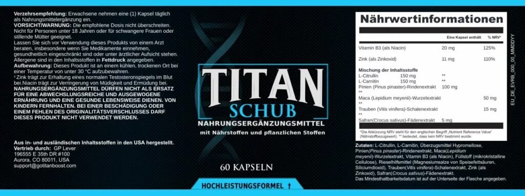 TitanSchub wird mit natürlichen Inhaltsstoffen formuliert, die häufig in Nahrungsergänzungsmitteln verwendet werden, um Energie, Leistungsfähigkeit und allgemeines Wohlbefinden zu unterstützen.
